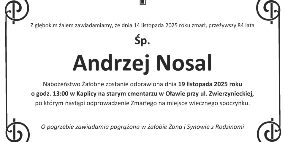 Z głębokim smutkiem zawiadamiamy, że 14 listopada 2025 roku, zmarł przeżywszy 84 lata, Śp. Andrzej Nosal.
