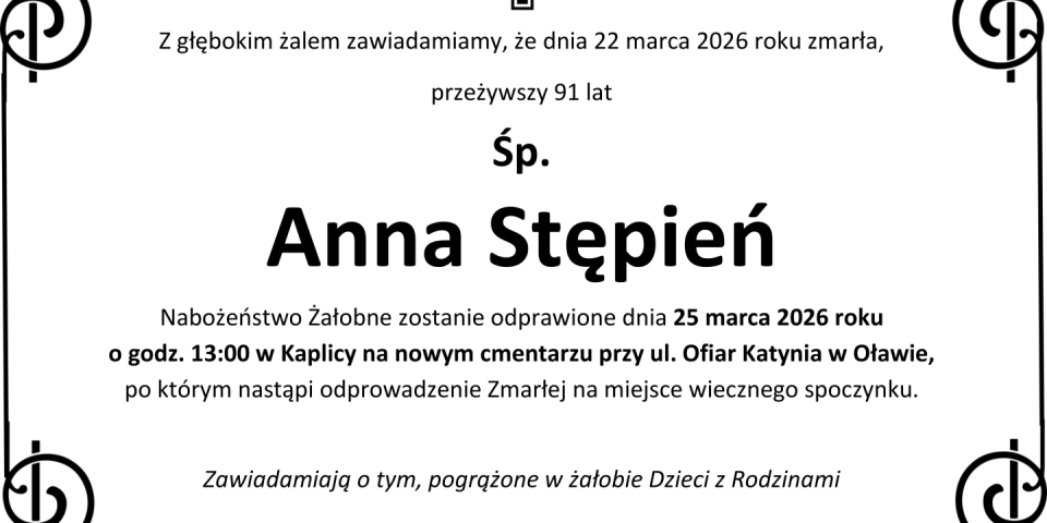 Z głębokim smutkiem zawiadamiamy, że 22 marca 2026 roku, zmarła przeżywszy 91 lat, Śp. Anna Stępień.