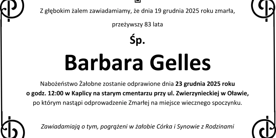 Z głębokim smutkiem zawiadamiamy, że 19 grudnia 2025 roku, zmarła przeżywszy 83 lata, Śp. Barbara Gelles.