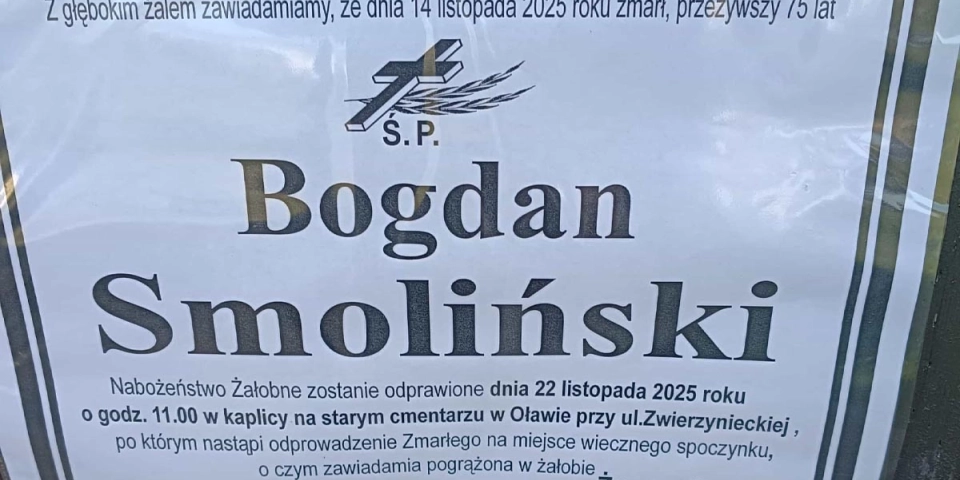Z głębokim smutkiem zawiadamiamy, że 14 listopada 2025 roku, zmarł przeżywszy 75 lat, Śp. Bogdan Smoliński.
