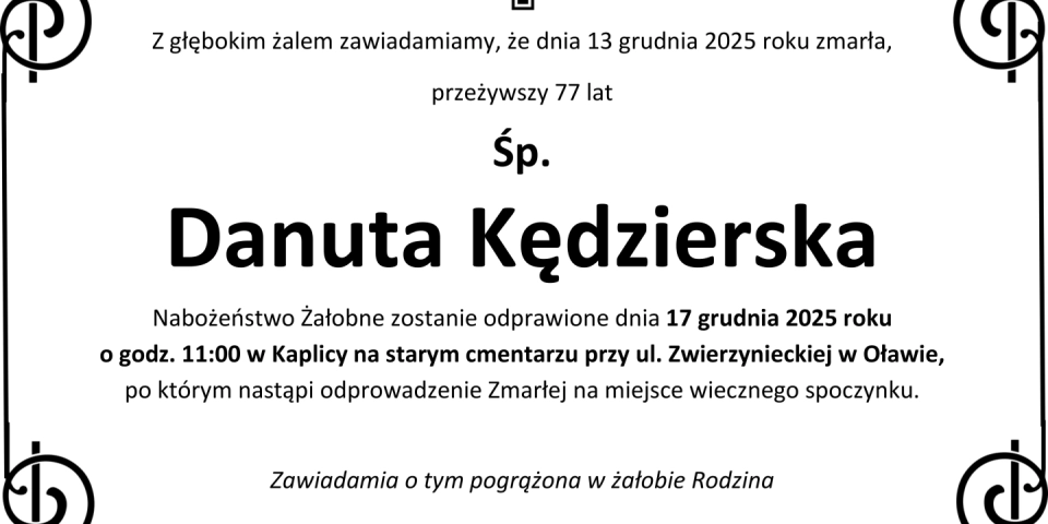 Z głębokim smutkiem zawiadamiamy, że 13 grudnia 2025 roku, zmarła przeżywszy 77 lat, Śp. Danuta Kędzierska.