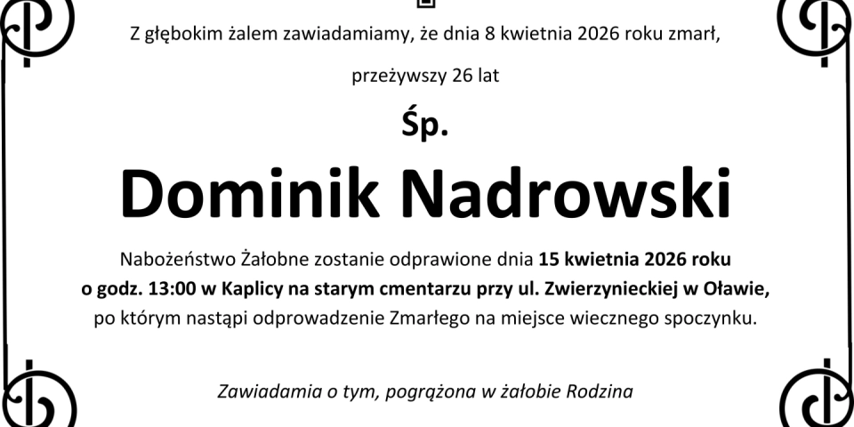 Z głębokim smutkiem zawiadamiamy, że 8 kwietnia 2026 roku, zmarł przeżywszy 26 lat, Śp. Dominik Nadrowski.
