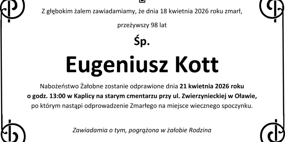 Z głębokim smutkiem zawiadamiamy, że 18 kwietnia 2026 roku, zmarł przeżywszy 98 lat, Śp. Eugeniusz Kott.