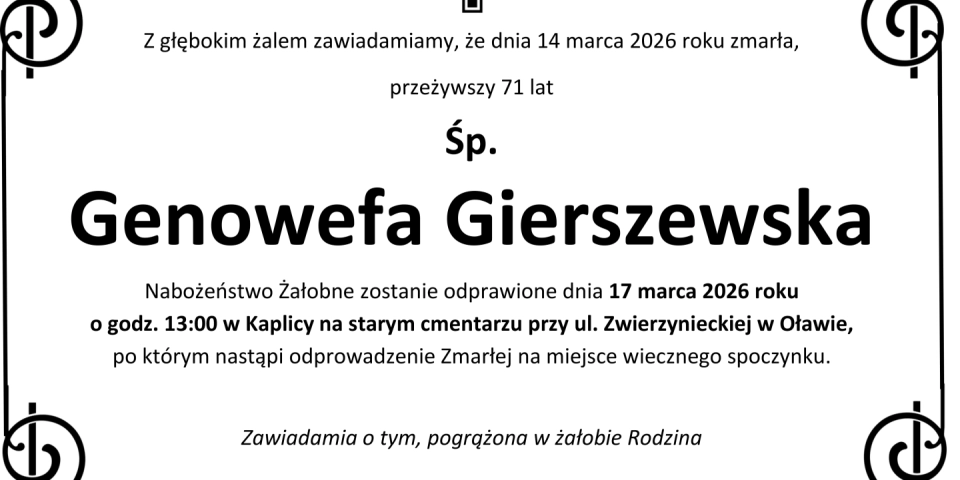 Z głębokim smutkiem zawiadamiamy, że 14 marca 2026 roku, zmarła przeżywszy 71 lat, Śp. Genowefa Gierszewska.