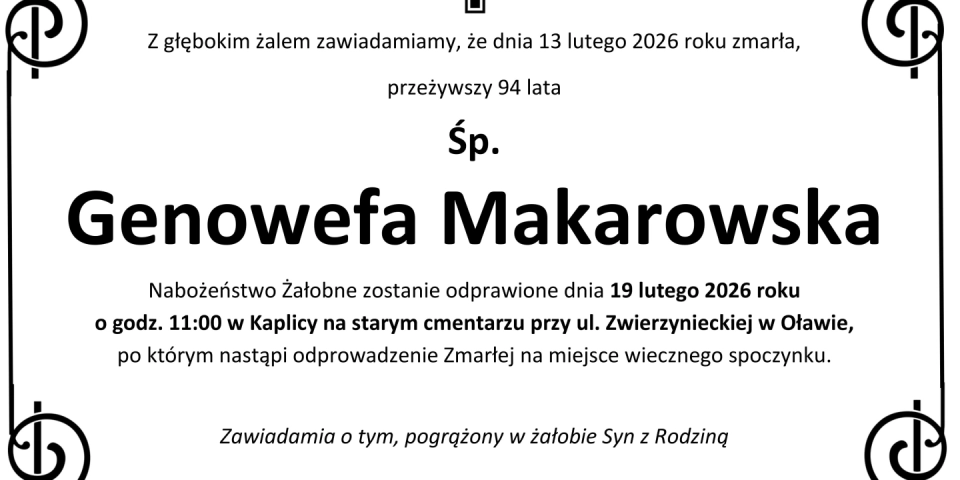 Z głębokim smutkiem zawiadamiamy, że 13 lutego 2026 roku, zmarła przeżywszy 94 lata, Śp. Genowefa Makarowska.