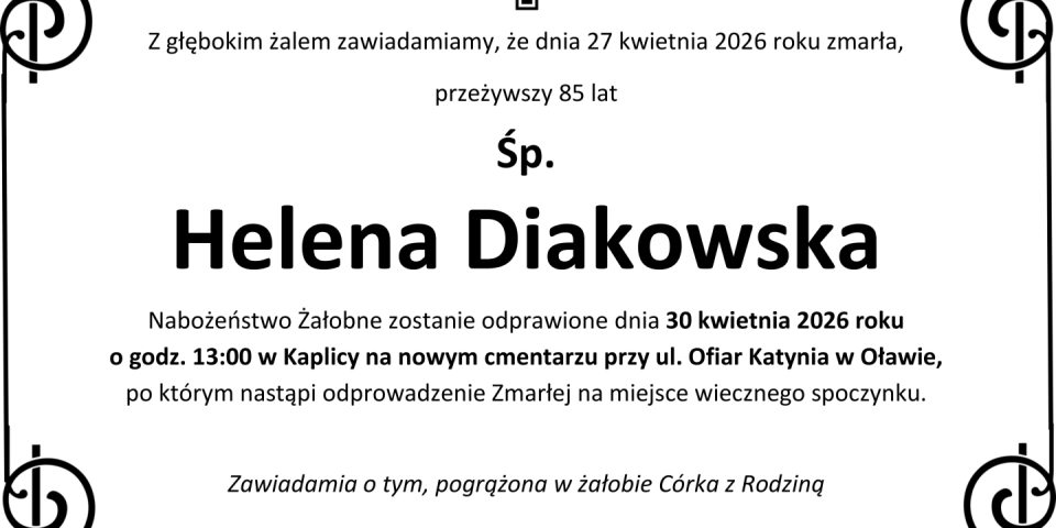 Z głębokim smutkiem zawiadamiamy, że 27 kwietnia marca 2026 roku, zmarła przeżywszy 85 lat, Śp. Helena Diakowska.