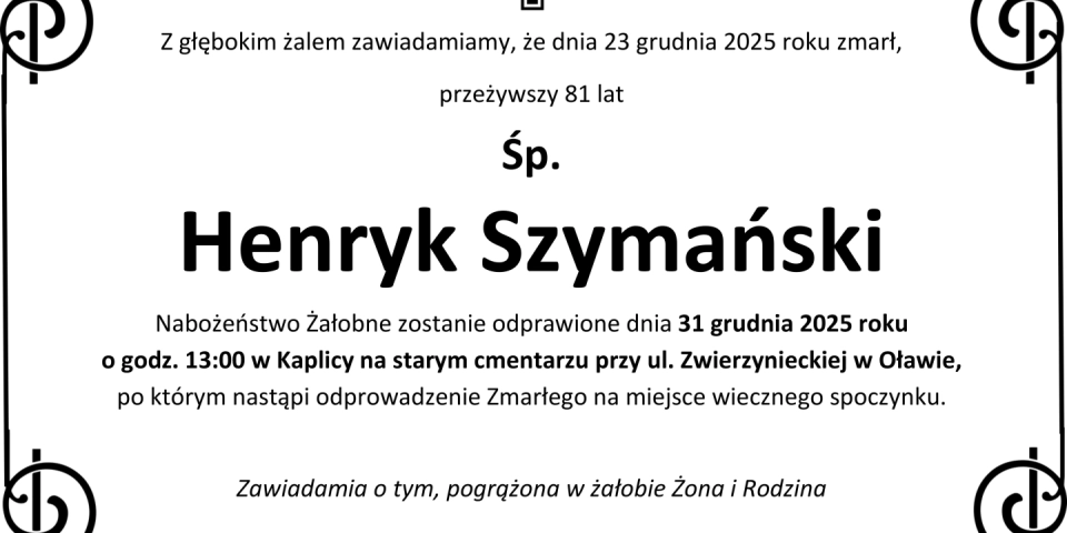 Z głębokim smutkiem zawiadamiamy, że 23 grudnia 2025 roku, zmarł przeżywszy 81 lat, Śp. Henryk Szymański.