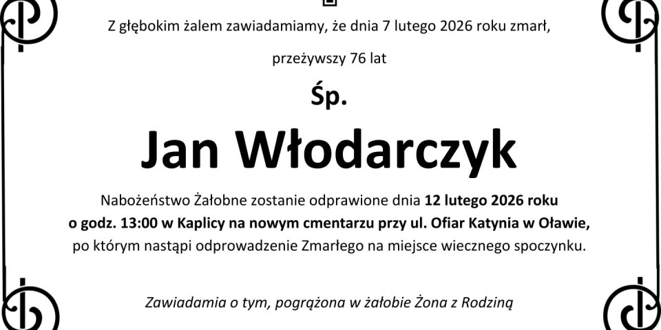 Z głębokim smutkiem zawiadamiamy, że 7 lutego 2026 roku, zmarł przeżywszy 76 lat, Śp. Jan Włodarczyk.