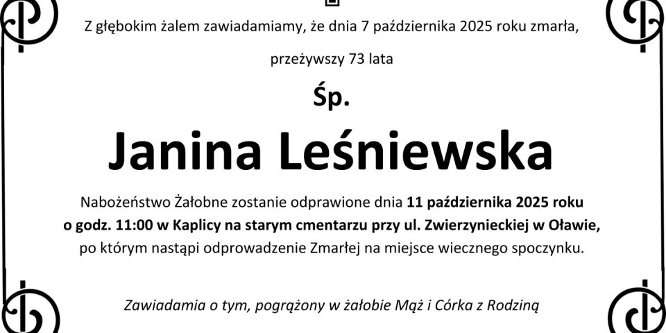 Z głębokim smutkiem zawiadamiamy, że 7 października 2025 roku, zmarła przeżywszy 73 lata, Śp. Janina Leśniewska.