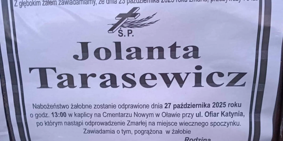 Z głębokim smutkiem zawiadamiamy, że 23 października 2025 roku, zmarła przeżywszy 70 lat, Śp. Jolanta Tarasewicz.