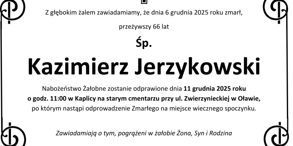 Z głębokim smutkiem zawiadamiamy, że 6 grudnia 2025 roku, zmarł przeżywszy 66 lat, Śp. Kazimierz Jerzykowski.
