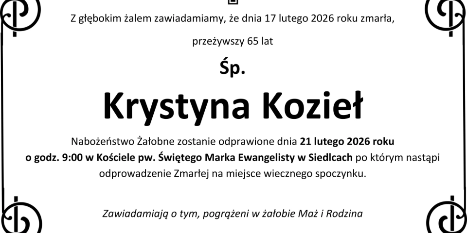 Z głębokim smutkiem zawiadamiamy, że 17 lutego 2026 roku, zmarła przeżywszy 65 lat, Śp. Krystyna Kozieł.
