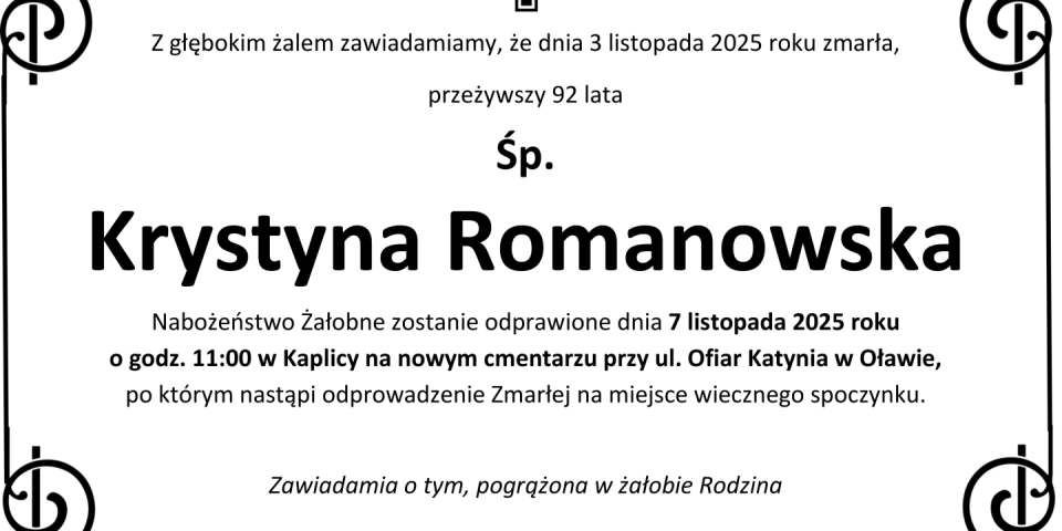Z głębokim smutkiem zawiadamiamy, że 3 listopada 2025 roku, zmarła przeżywszy 92 lata, Śp. Krystyna Romanowska.