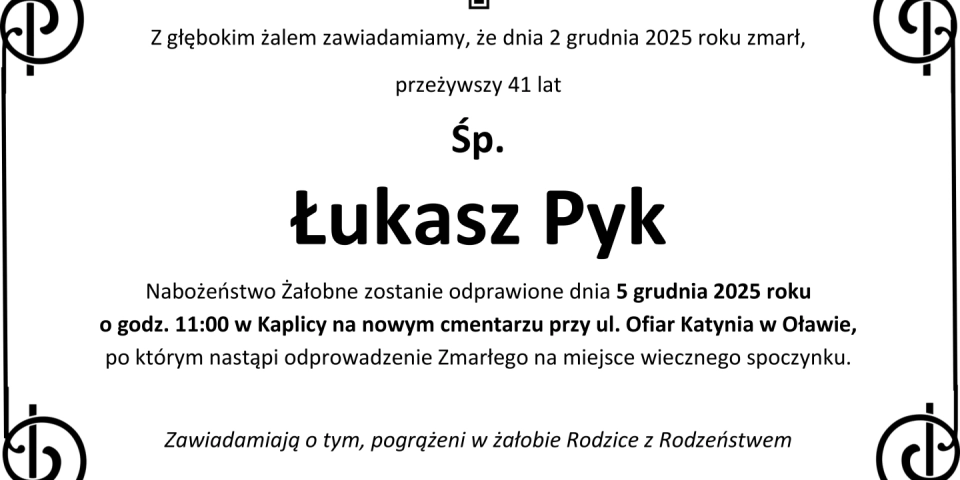 Z głębokim smutkiem zawiadamiamy, że 2 grudnia 2025 roku, zmarł przeżywszy 41 lat, Śp. Łukasz Pyk.