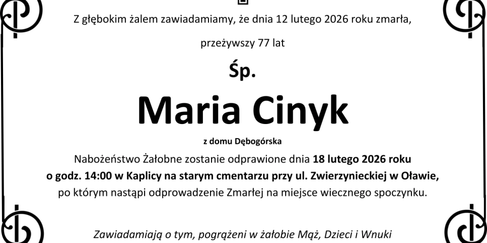 Z głębokim smutkiem zawiadamiamy, że 12 lutego 2026 roku, zmarła przeżywszy 77 lat, Śp. Maria Cinyk z domu Dębogórska.