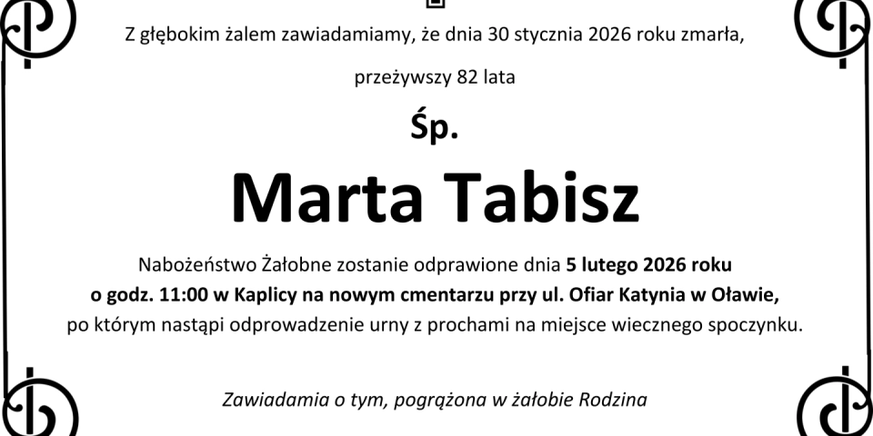 Z głębokim smutkiem zawiadamiamy, że 30 stycznia 2026 roku, zmarła przeżywszy 82 lata, Śp. Marta Tabisz.