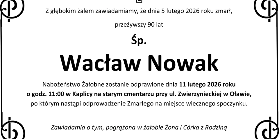 Z głębokim smutkiem zawiadamiamy, że 5 lutego 2026 roku, zmarł przeżywszy 90 lat, Śp. Wacław Nowak.
