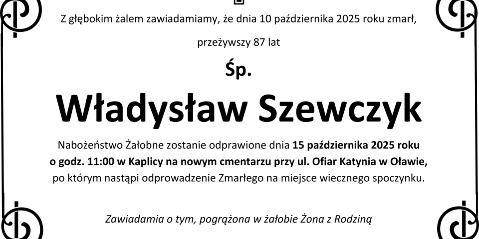 Z głębokim smutkiem zawiadamiamy, że 10 października 2025 roku, zmarł przeżywszy 87 lat, Śp. Władysław Szewczyk.