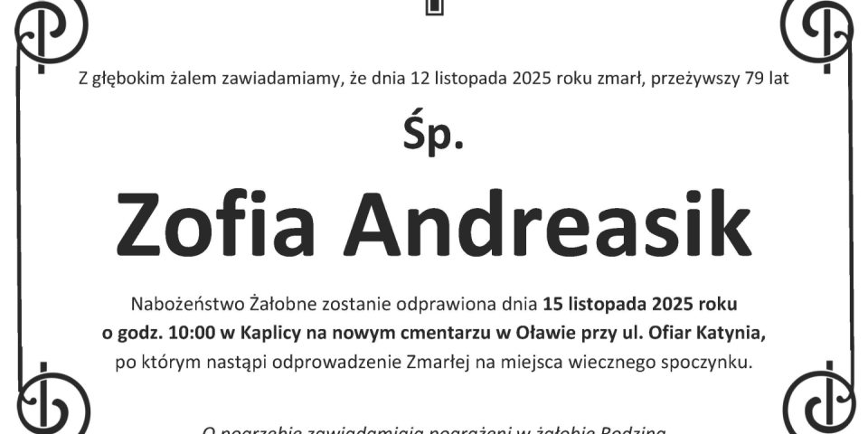 Z głębokim smutkiem zawiadamiamy, że 12 listopada 2025 roku, zmarła przeżywszy 79 lat, Śp. Zofia Andreasik.