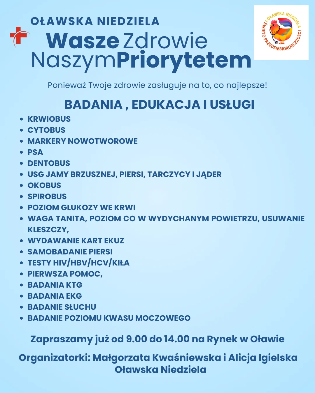 Badania będą dostępne zarówno w Rynku, jak i w Ratuszu. Nie są wymagane wcześniejsze zapisy - wystarczy przyjść i poczekać w kolejce. - Dzięki poprzednim edycjom udało nam się już przebadać ponad 4 tysiące osób – to prawie 10% całej Oławy! A my mamy plan przebadać… wszystkich. Bo macie być zdrowi - informują organizatorki.
