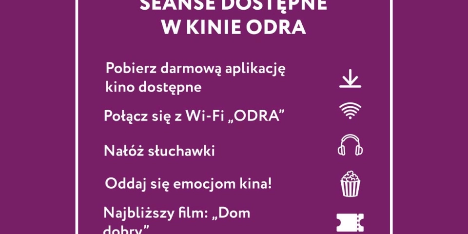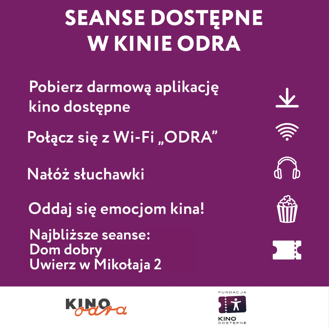 W kinie Odra dostępne są seanse z audiodeskrypcją z wykorzystaniem aplikacji Kino Dostępne! - Dzięki temu osoby niewidome i słabowidzące mogą cieszyć się magią kina. Wystarczy pobrać bezpłatną aplikację Kino Dostępne, która umożliwia odsłuch audiodeskrypcji w trakcie seansu – prosto z własnego smartfona. Konieczne jest posiadanie słuchawek dousznych- informuje Centrum Sztuki.