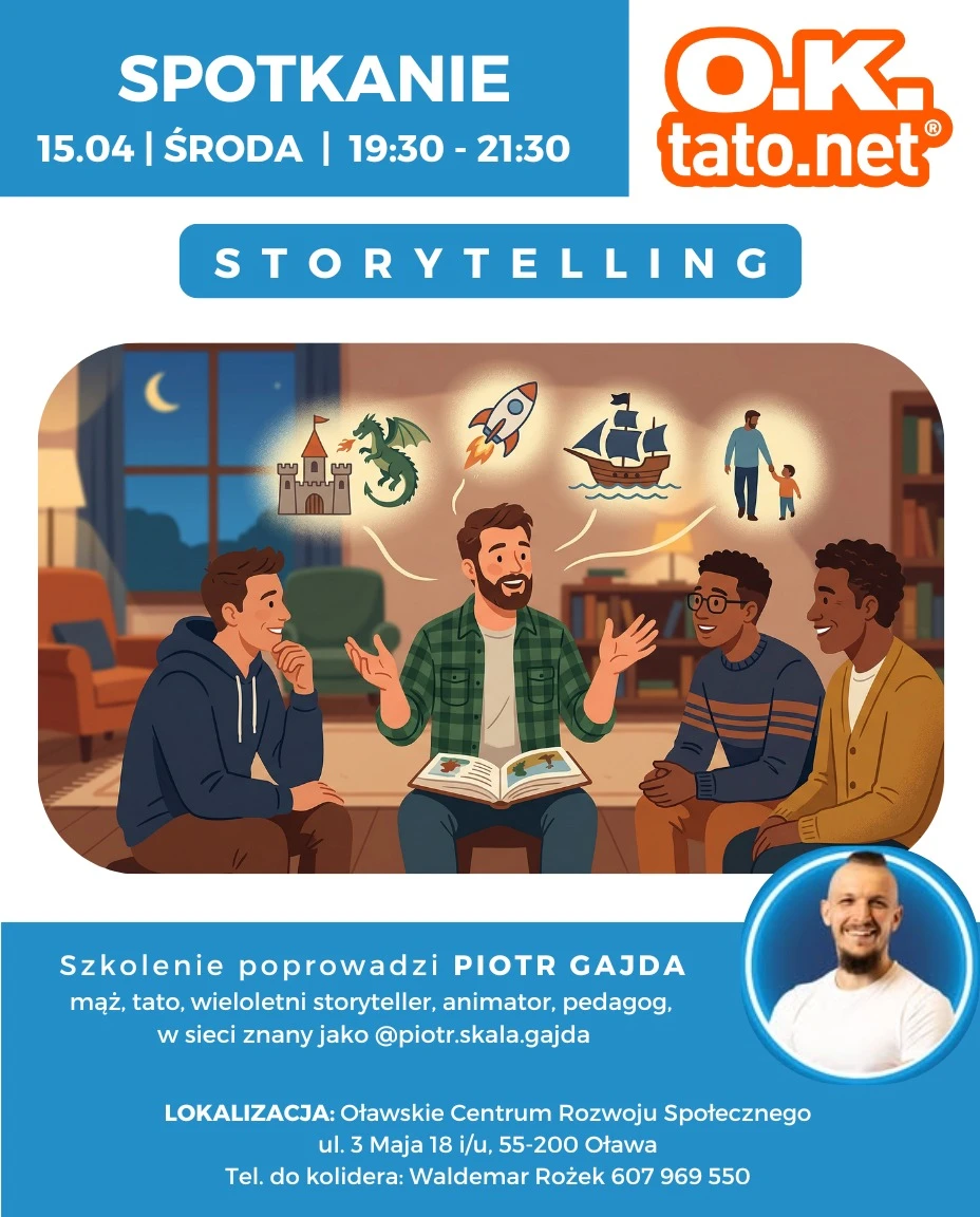 - Czas odpoczynku, refleksji, zadumy mija i wraca proza życia. A w niej nasze obowiązki zawodowe, ale też pragnienie pielęgnacji więzi z najbliższymi. Jeśli więzi to oddawanie czasu i uwagi. Jeśli oddawanie czasu to wspólne rozrywki, aktywności fizyczne, gry planszowe, prace domowe, ale też rozmowy, w tym opowiadanie historii. Czy wiesz, że są techniki, które mogą uczynić Twoje opowieści o dzieciństwie, o pierwszej miłości, o wyprawach, o dziadkach, o szkole i o wielu innych sprawach z przeszłości prawdziwie fascynującymi thrillerami, albo przejmującymi przygodami w oczach Twoich dzieci? Jeśli chciałbyś spróbować swoich sił i rozwinąć się w tym kierunku to zaplanuj sobie środowy wieczór 15 kwietnia - informują organizatorzy.