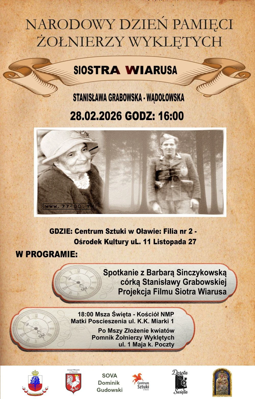 28 lutego o godzinie 16:00 w Ośrodku Kultury przy ul. 11 Listopada 27, odbędzie się wydarzenie "Siostra Wiarusa" w ramach Narodowego Dnia Pamięci Żołnierzy Wyklętych. Spotkanie poświęcone będzie Stanisławie Grabowskiej-Wądołowskiej, związanej z powojennym podziemiem niepodległościowym.