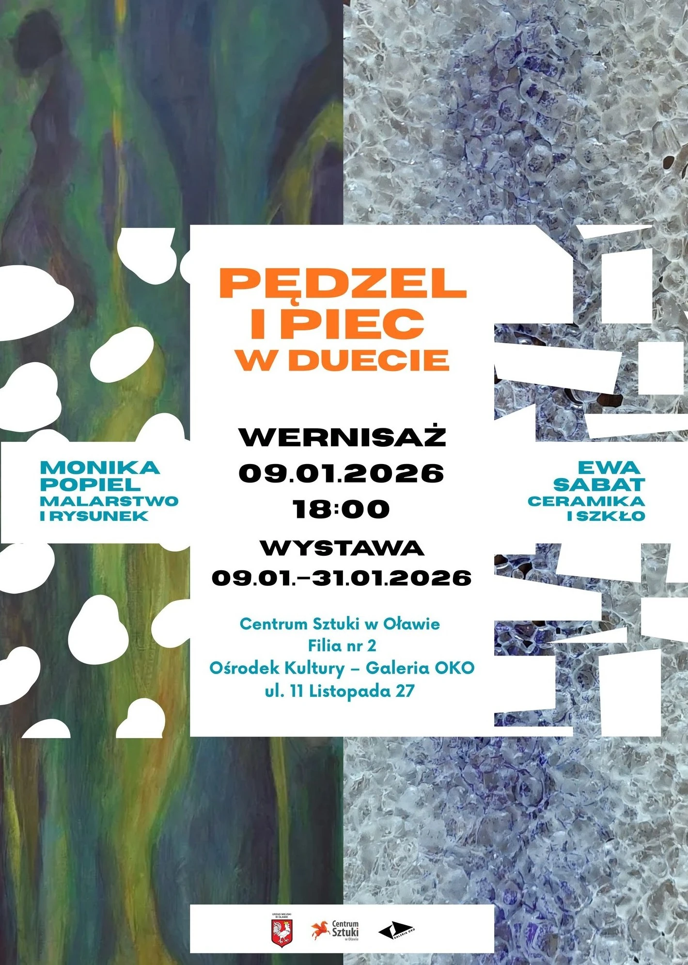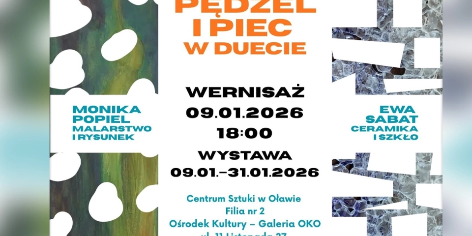 W styczniu w Galerii Oko można zobaczyć wystawę malarstwa Moniki Popiel oraz ceramiki i szkła Ewy Sabat, pt. Pędzel i piec w duecie. Wernisaż odbędzie się w 09 stycznia o godzinie 18.00.