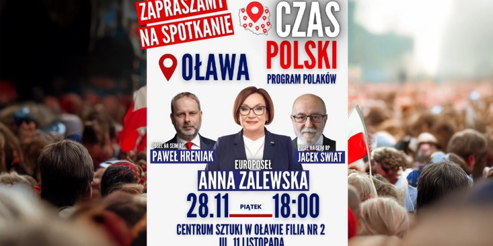 W najbliższy piątek, 28 listopada, w Oławie odbędzie się otwarte spotkanie z mieszkańcami, podczas którego o programie Prawa i Sprawiedliwości dla Polski rozmawiać będą europosłanka Anna Zalewska oraz posłowie na Sejm RP - Paweł Hreniak i Jacek Świat.