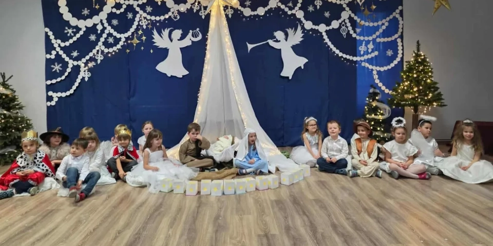 Swoje umiejętności artystyczne zaprezentowały dzieci z grupy trzeciej "Malinki". Mali artyści wystąpili w przygotowanym programie jasełkowym, który obejmował recytacje, śpiew kolęd oraz elementy inscenizacji związanej z tematyką Bożego Narodzenia.