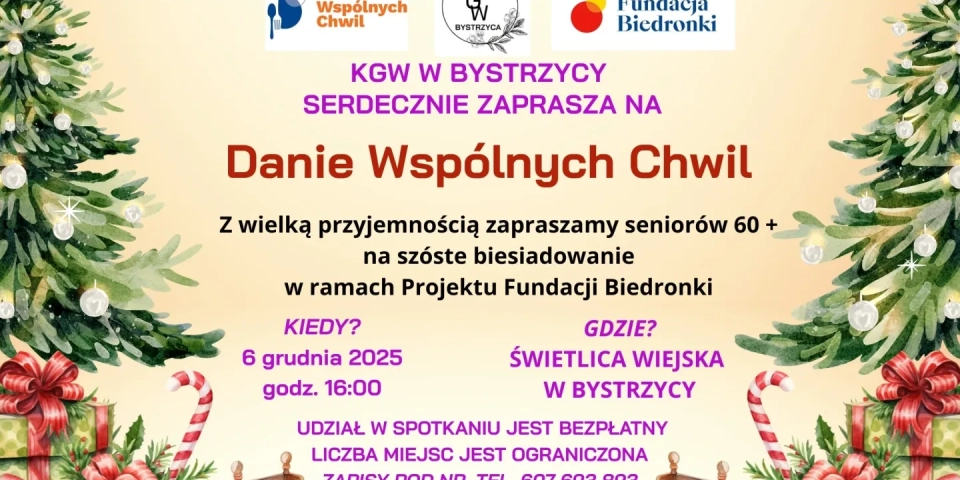 Już 6 grudnia o godz. 16:00 w Świetlicy Wiejskiej w Bystrzycy odbędzie się kolejne spotkanie dla seniorów organizowane przez KGW w ramach programu Danie Wspólnych Chwil Fundacji Biedronki.