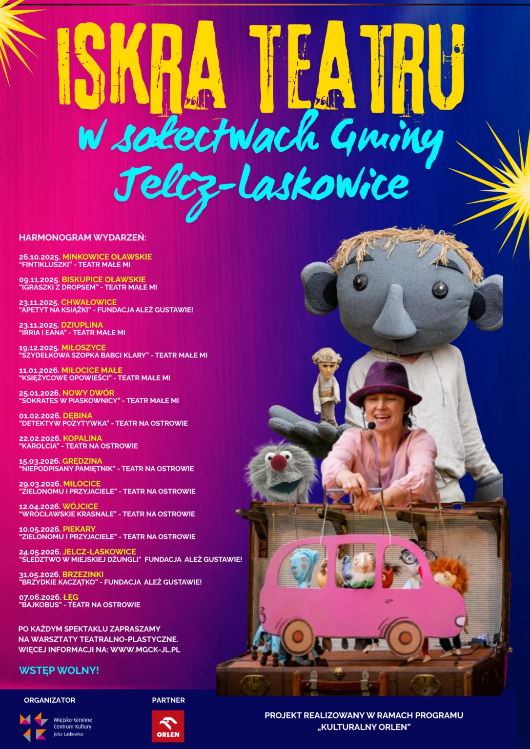 W ramach projektu, mieszkańcy gminy Jelcz-Laskowice będą mogli bezpłatnie uczestniczyć w aż szesnastu spektaklach i warsztatach artystycznych.
