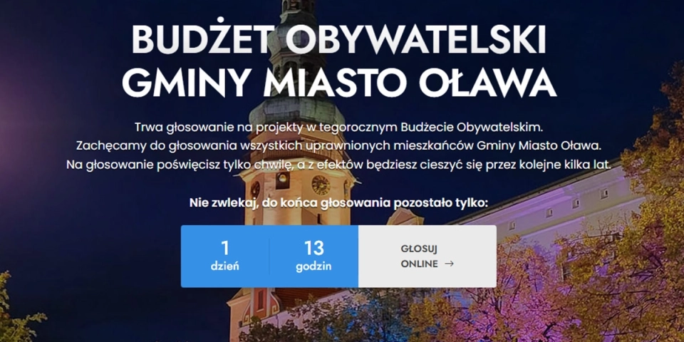 13 sierpnia w Oławie ruszyło głosowanie w ramach Budżetu Obywatelskiego. Mieszkańcy mogą wybierać spośród trzech propozycji. Głosowanie potrwa do 26 sierpnia i dostępne jest zarówno online, jak i w punkcie stacjonarnym w Urzędzie Miejskim. Sprawdź, jak oddać głos i jakie projekty biorą w nim udział.