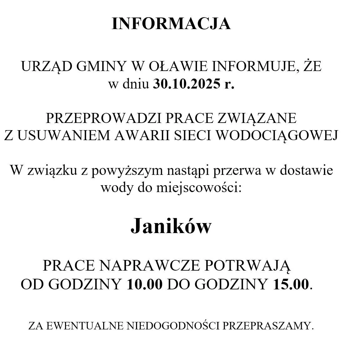 W związku z usuwaniem awarii na sieci wodociągowej w Janikowie nie ma wody. Komunikat obowiązuje 30 października od 10:00 do 15:00. - Za utrudnienia przepraszamy- informuje gmina Oława.