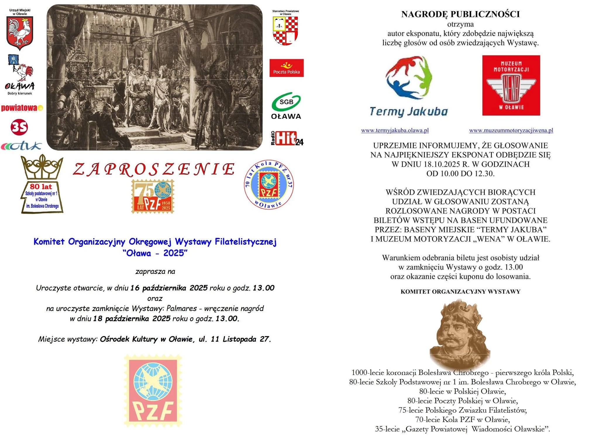 Koło Polskiego Związku Filatelistów nr 37 w Oławie wraz z Zarządem Okręgu Wrocławskiego PZF zapraszają na Okręgową Wystawę Filatelistyczną „OŁAWA 2025”, organizowaną z okazji 1000-lecia koronacji Bolesława Chrobrego, pierwszego króla Polski.
