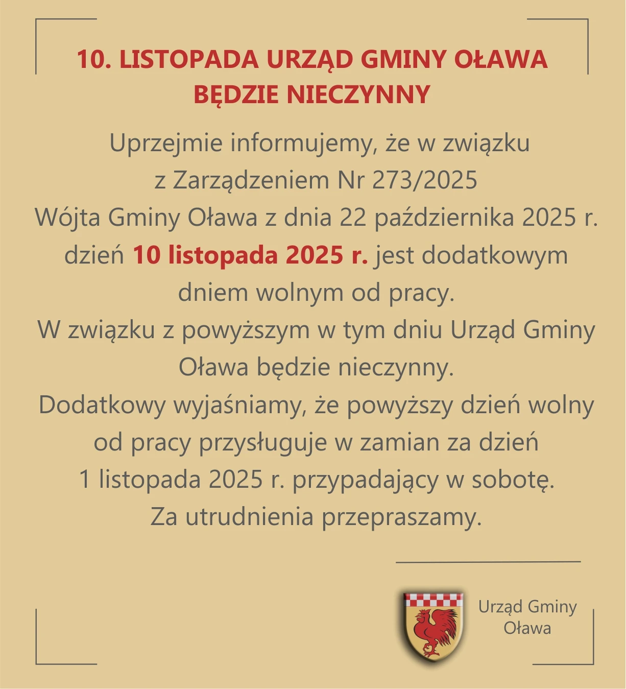 10 listopada Urząd Gminy będzie nieczynny. Dzień wolny od pracy przysługuje w zamian za dzień 1 listopada, który wypada w sobotę.