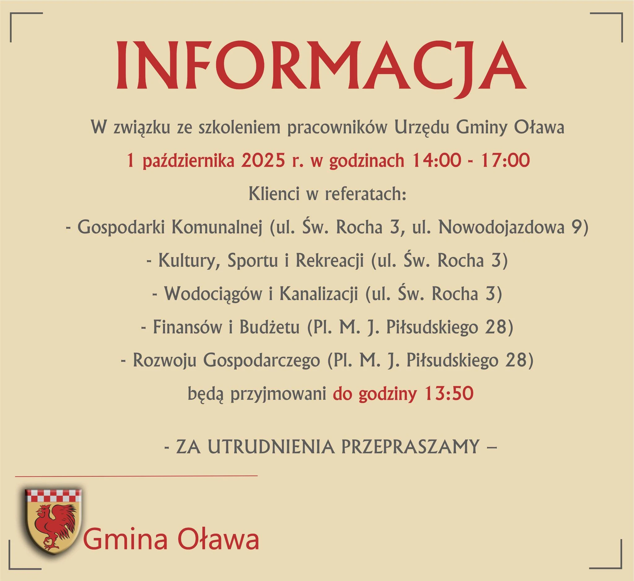 W związku ze szkoleniem kilka referatów w urzędzie będzie funkcjonowało inaczej.