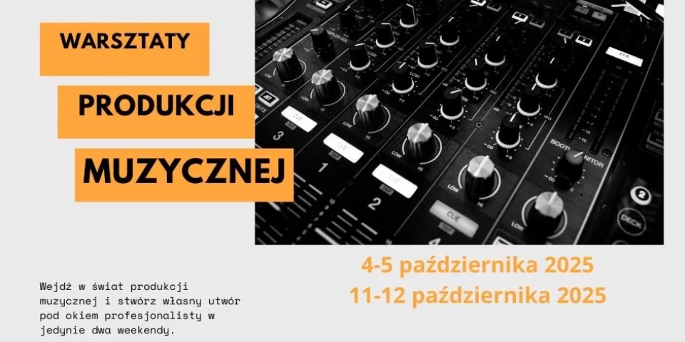 W dniach 4-5 października oraz 11-12 października odbędą się warsztaty produkcji muzycznej. Chciałbyś nauczyć się tworzenia brzmienia od podstaw? - Podczas zajęć: odkryjesz, jak powstaje muzyka od pomysłu do gotowego tracku, poznasz techniki miksu i podstawy masteringu, nauczysz się pracować w profesjonalnym oprogramowaniu, stworzysz własny utwór pod okiem doświadczonego instruktora- informuje Centrum Sztuki.