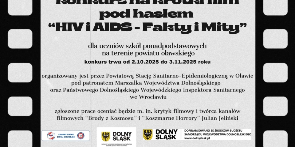 Powiatowa Stacja Sanitarno-Epidemiologiczna w Oławie zaprasza uczniów szkół ponadpodstawowych na terenie powiatu oławskiego do wzięcia udziału w konkursie na krótki film pod hasłem „HIV i AIDS – Fakty i Mity”.