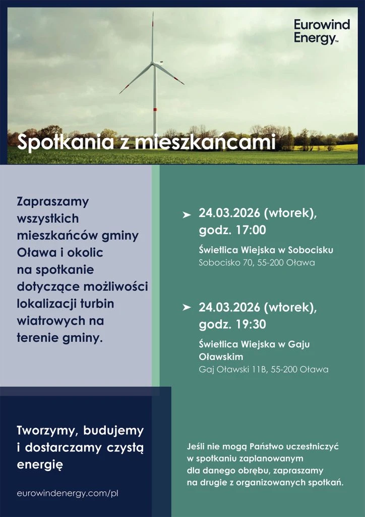 Mieszkańcy gminy Oława będą mieli okazję wziąć udział w spotkaniach informacyjnych dotyczących możliwości lokalizacji turbin wiatrowych na terenie gminy. Wydarzenia organizuje firma Eurowind Energy, która zaprasza wszystkich zainteresowanych do rozmowy i zadawania pytań na temat inwestycji.
