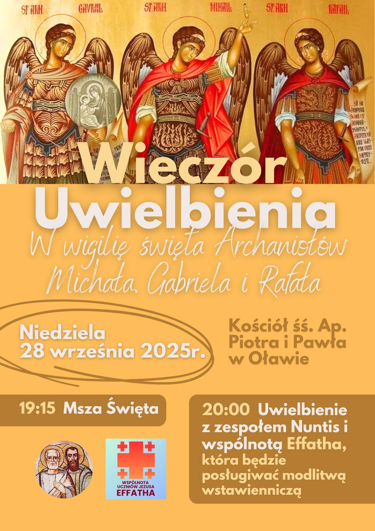 W najbliższą niedzielę, 28 września w parafii Piotra i Pawła w Oławie odbędzie się pierwszy po wakacyjnej przerwie Wieczór Uwielbienia. Wydarzenie zaplanowano w przeddzień święta Archaniołów Michała, Gabriela i Rafała.