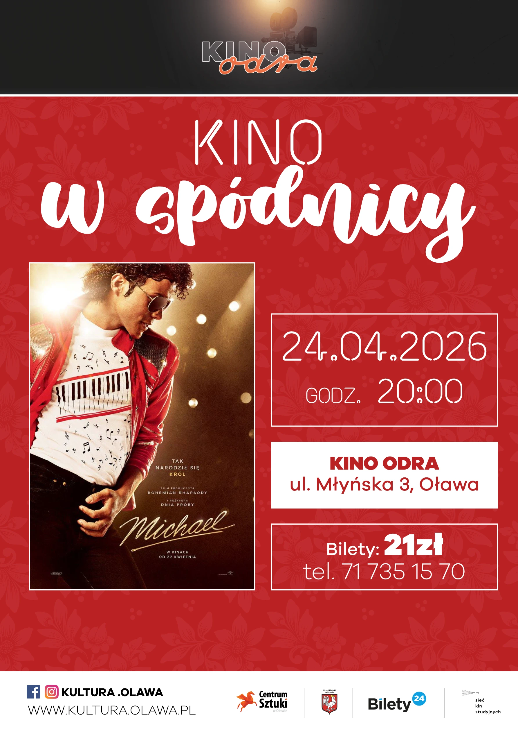 24 kwietnia godziny 20:00 w Kinie Odra odbędzie się seans z cyklu Kino w spódnicy, tym razem na ekranie wyświetlony zostanie “Michael”. - Film historię Michaela Jacksona nie tylko przez pryzmat jego muzyki – od momentu, gdy został odkryty jako wokalista Jackson Five, aż po czasy, gdy stał się wizjonerem i dążył do tego, by zostać największym artystą rozrywkowym na świecie. Oprócz życia prywatnego, film przywołuje też jego najsłynniejsze występy z początków solowej kariery, dając widzom wyjątkową okazję, by zobaczyć Michaela Jacksona jak nigdy dotąd. To tutaj zaczyna się jego historia- informuje Centrum Sztuki.