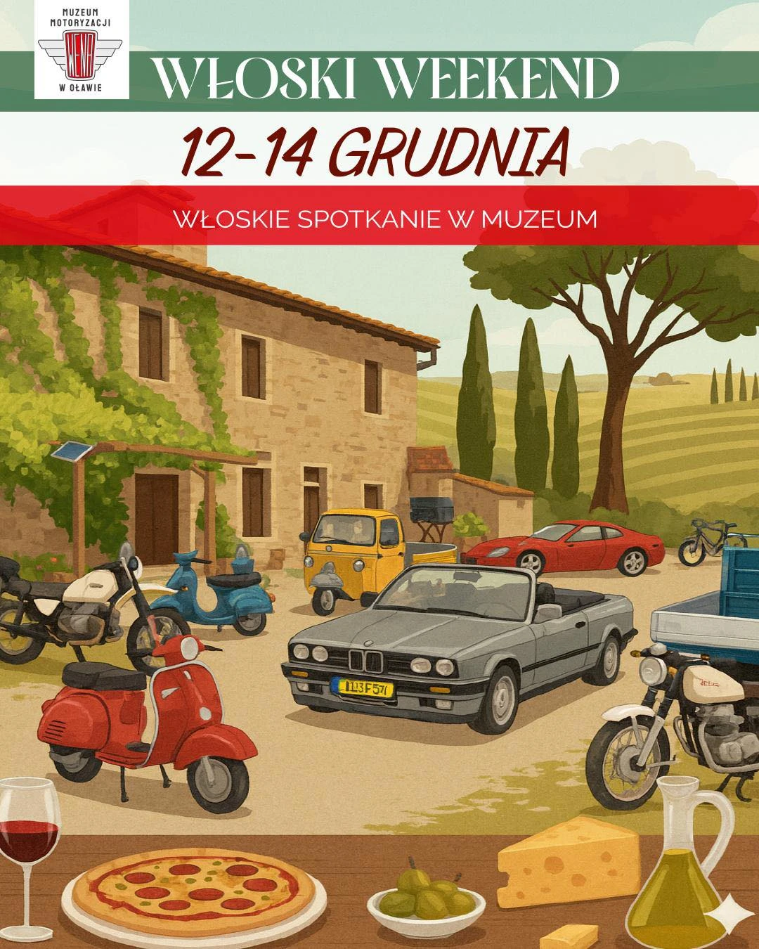 Włoski Weekend potrwa od 12 do 14 grudnia. W tych dniach Muzeum motoryzacji Wena w Oławie odwiedzą nie tylko miłośnicy motoryzacji, ale i dobrego jedzenia ze słonecznej Toskanii. Mistrzem ceremonii będzie Tomek Tommaso Tryba z Wino i Śpiew.