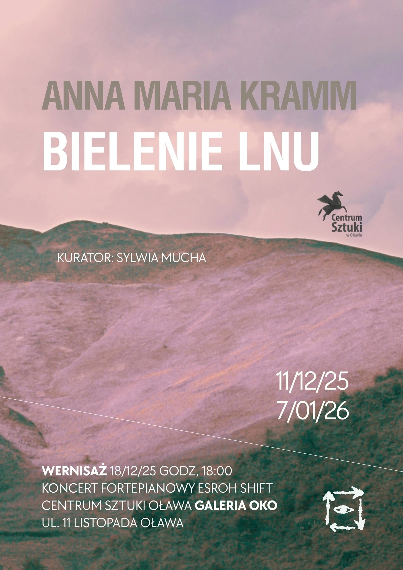18 grudnia o godzinie 18:00 w Galerii Oko odbędzie się wernisaż wystawy malarstwa Anny Marii Kramm pt. Bielenie lnu. Wydarzenie będzie połączone z wykładem oraz koncertem fortepianowym artysty występującego pod pseudonimem Esroh Shift.