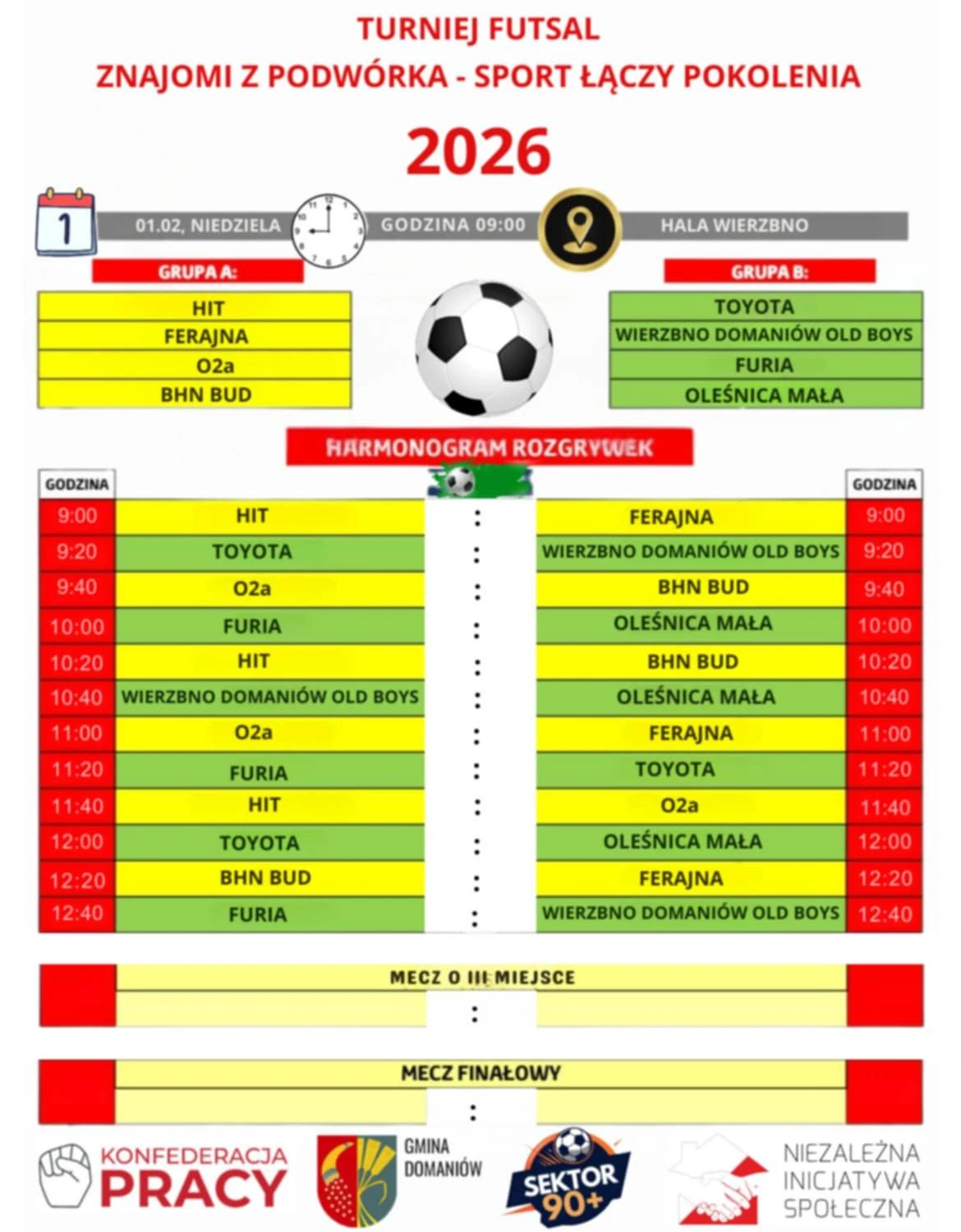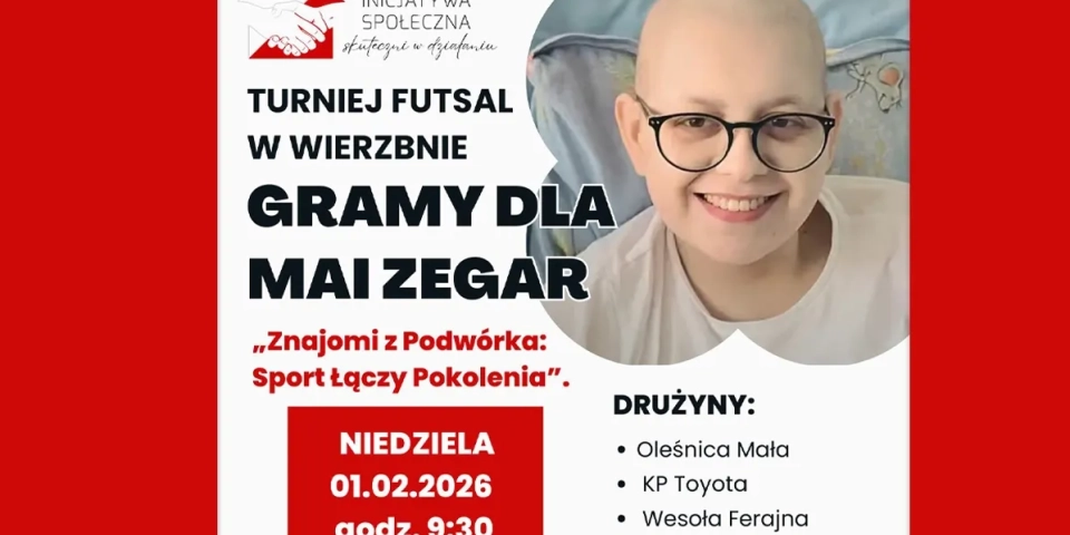Sportowe emocje i pomoc w szczytnym celu połączą się podczas charytatywnego turnieju futsalu, który odbędzie się 1 lutego o godzinie 9:30 w Hali im. Szymona Kołeckiego w Wierzbnie. Wydarzenie organizowane jest, by wesprzeć leczenie Mai Zegar, chorującej na złośliwy nowotwór kości. Podczas turnieju prowadzona będzie zbiórka środków finansowych na terapię i dalsze leczenie nastolatki. Najlepsze zespoły turnieju otrzymają puchary, a indywidualne wyróżnienia trafią do najlepszego zawodnika oraz najlepszego bramkarza zawodów.