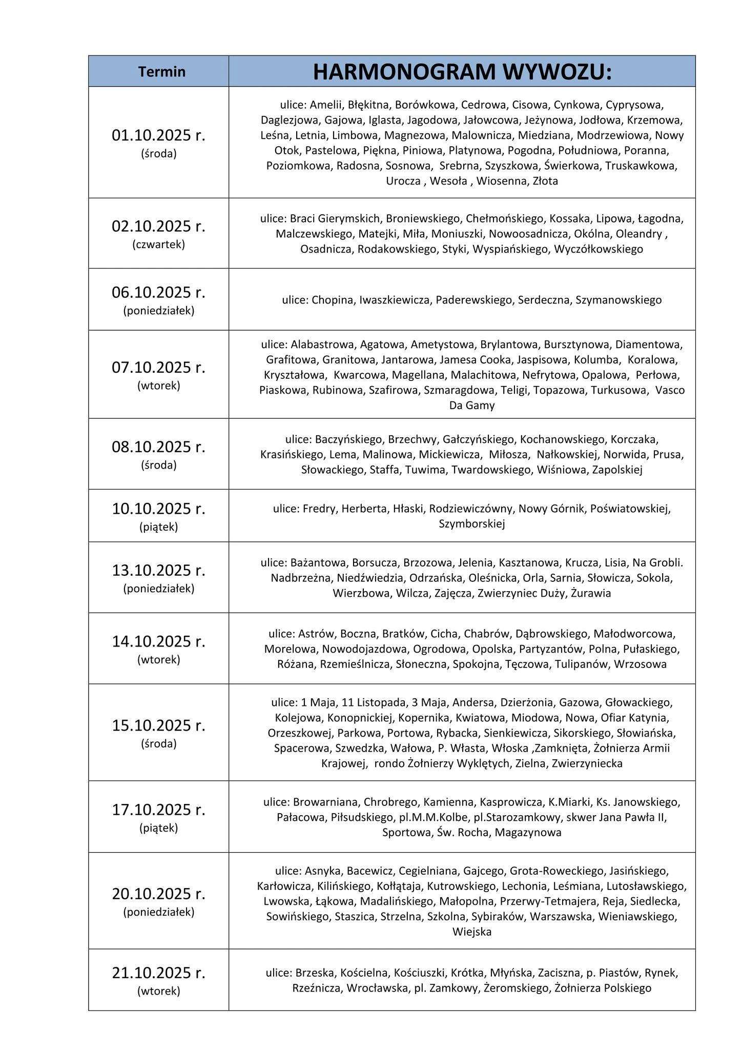 - Odpady wystawione po dniu wywozu lub po przejechaniu pojazdu w danym dniu, nie będą odebrane.