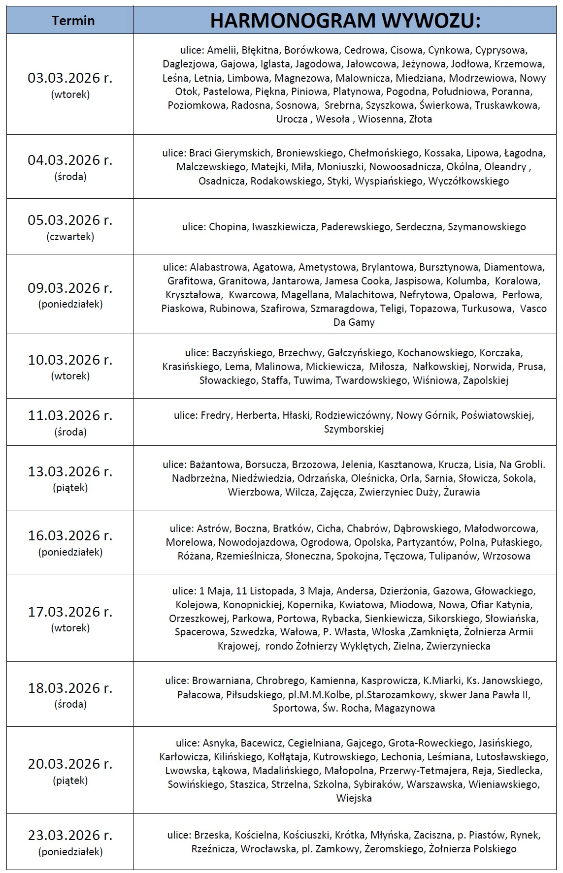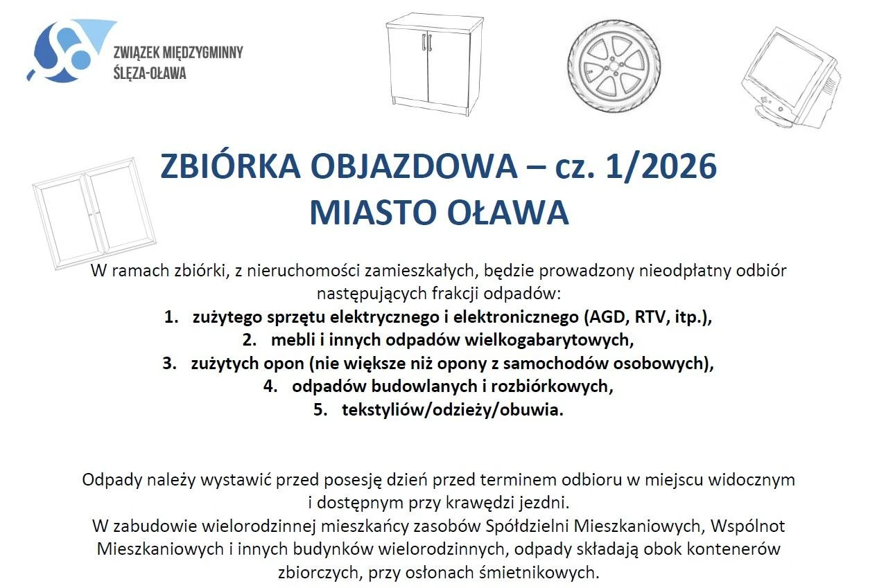 W dniach od 3 do 23 marca na terenie Oławy odbędzie się objazdowa zbiórka odpadów. Mieszkańcy mogą oddać: zużyty sprzęt elektryczny i elektroniczny (AGD, RTV, itp.), meble i inne odpady wielkogabarytowe, zużyte opony (nie większe niż opony z samochodów osobowych), odpady budowlane i rozbiórkowe, tekstylia, odzież, obuwie.