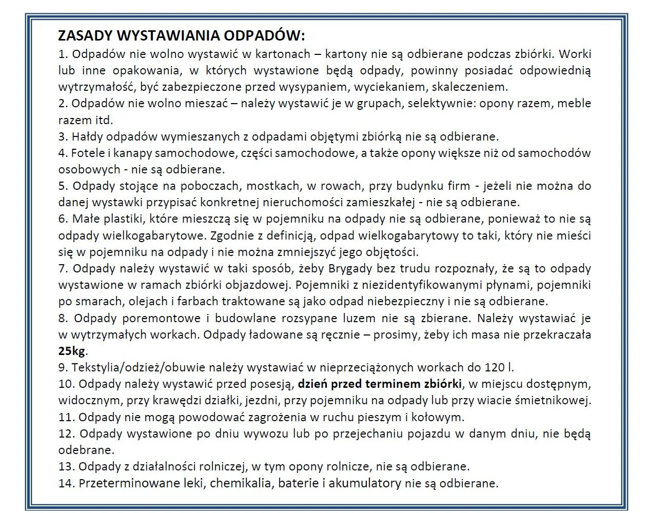 Warto pamiętać, aby odpady wystawić przed posesję dzień przed terminem odbioru.
