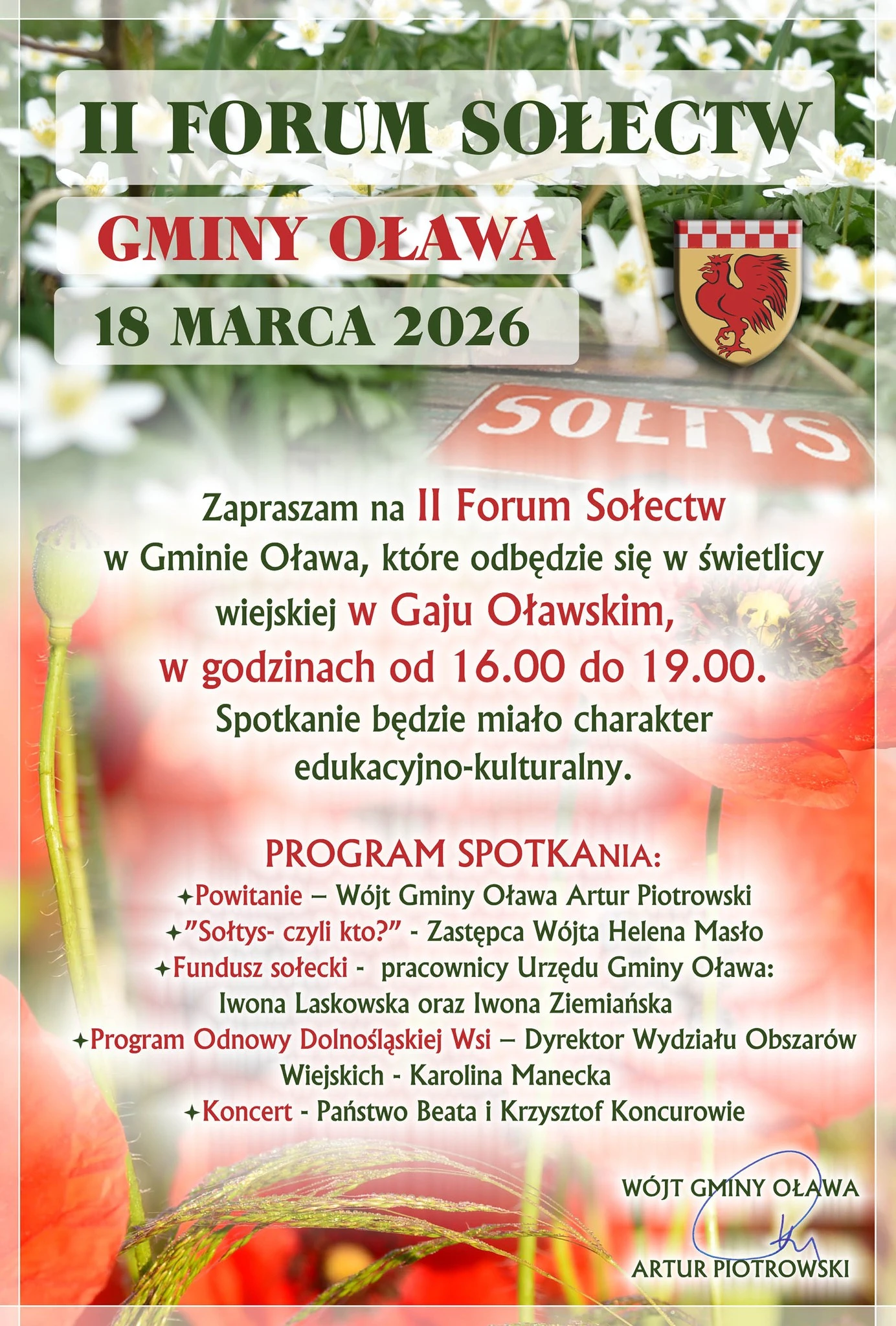 II Forum Sołectw Gminy Oława odbędzie się 18 marca w świetlicy wiejskiej w Gaju Oławskim. Wydarzenie jest skierowane do Sołtysów oraz członków Rad Sołeckich z terenu Gminy Oława. Program spotkania obejmuje część merytoryczną, podczas której poruszone zostaną zagadnienia dotyczące rozwoju sołectw, w tym m.in. fundusz sołecki oraz Program Odnowy Dolnośląskiej Wsi.