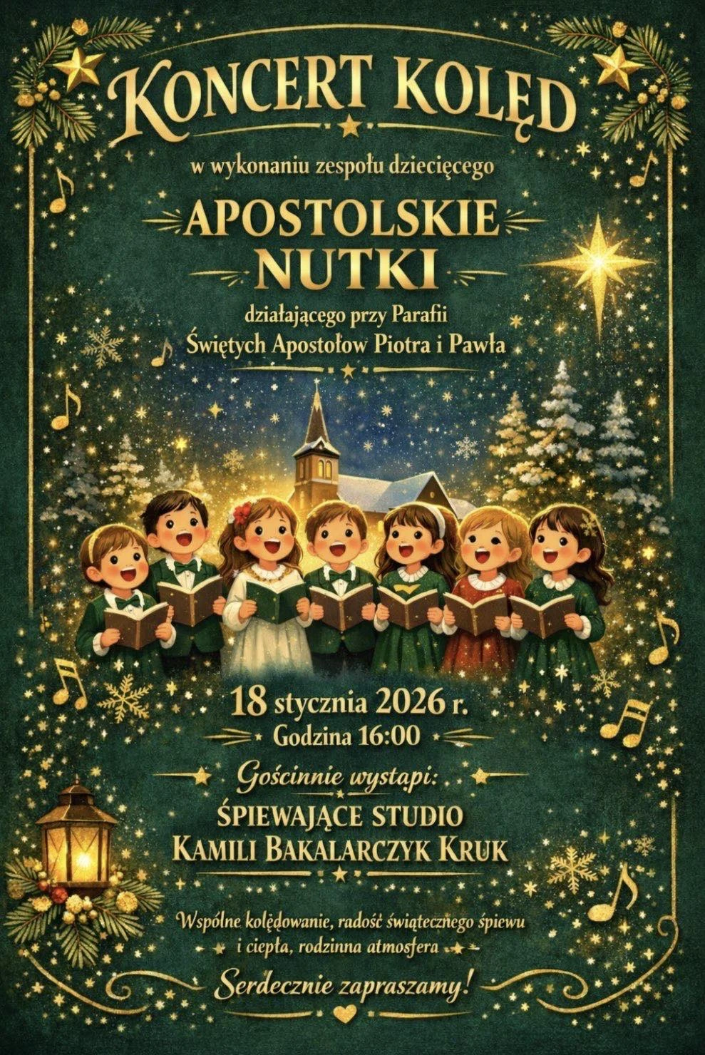 W niedzielę 18 stycznia o godzinie 16:00 w kościele Piotra i Pawła odbędzie się wyjątkowy koncert kolęd i pastorałek. Przed publicznością wystąpi dziecięca schola Apostolskie Nutki wraz ze Śpiewającym Studiem Kamili Bakalarczyk-Kruk. Młodzi artyści zaprezentują znane i lubiane kolędy oraz pastorałki, wnosząc w ich wykonanie dziecięcą radość, świeżość i szczerość.
